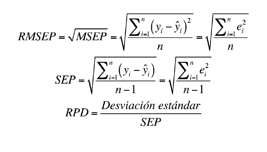 n n: número de muestras, EEPM: error estándar de predicción media, REEPM: raíz del error estándar de predicción media, EEP: error estándar de predicción / n: sample size, MSEP: mean standard error of prediction, RMSEP root mean square error of prediction, SEP: standard error of prediction.