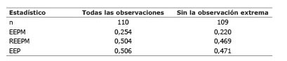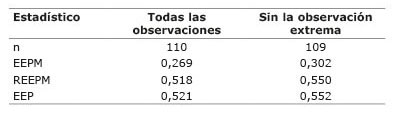 En el caso de la regresión por MCP, los diagnósticos del modelo presentaron dificultades para el análisis de los valores extremos. El análisis de normalidad, heteroscedasticidad y linealidad fueron satisfactorios, al igual que todos los diagnósticos para el caso de la regresión por RCP. Sin embargo, se constató que una misma observación constituyó un posible punto de influencia en ambos modelos de regresión. No se utilizó ninguna medida remedial dado el cumplimiento satisfactorio de los supuestos. No obstante, se decidió estimar los modelos de regresión sin el valor extremo y con todos los casos en ambos métodos de regresión, para verificar la posible mejora a nivel de los estadísticos de bondad y de ajuste.
