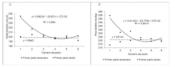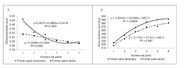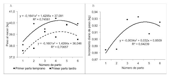 El PDV respondió de forma cuadrática al número de parto (p≤0,05); este comportamiento es atribuible al avance en la madurez biológica de las vacas (BIF, 2002; Rogers et al., 2002; Rumph y van Vleck, 2004). Sin embargo, los animales con primer parto tardío consistentemente pesaron menos al destete (Figura 1B). Los puntos de inflexión fueron 5,9 y 6,4 partos para las vacas de primer parto temprano y tardío. Por lo anterior, se podría especular que las vacas cuya primera preñez es tardía son genéticamente de menor peso corporal o que su madurez fisiológica la alcanzan a mayor edad.