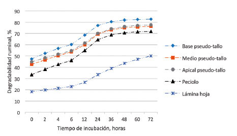En el vástago y el peciolo de la hoja la velocidad de degradación fue desde un 5,8%/hora hasta un máximo de 7,5%/hora, mientras que en la lámina fue significativamente menor (p<0,05) al alcanzar únicamente un 1,6%/hora, lo que indicó que el material poseía una fracción potencialmente degradable reducida en el rumen, si se compara con el resto de muestras estudiadas (Cuadro 3). Estos valores fueron más altos que lo determinado por Katongole et al. (2008), quienes indicaron una velocidad de degradación ruminal de 4,7%/h en vainas del pseudo-tallo; pero más bajos que lo reportado por los mismos autores para la hoja (3,7%/h).