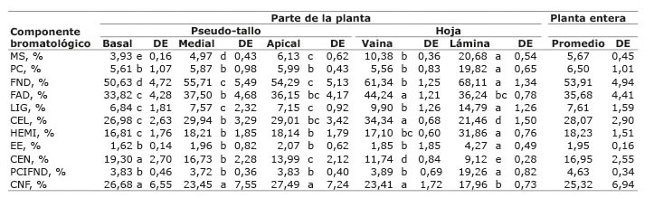 Letras diferentes en las columnas indican diferencias significativas (p<0,05) entre las secciones de la planta para un mismo componente bromatológico / Different letters in columns indicate statistical differences (p<0.05) among the parts of the plant for each nutritional component.