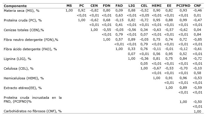 Se encontró una relación sobre el 90% que actúa de forma directamente proporcional entre el contenido de MS y el porcentaje de PC, HEMI y PCIFND (Cuadro 2), estos resultados difirieron de lo observado en otros forrajes tropicales como el pasto humidícola ( Brachiaria humidícola (Rendle) Schweick), donde la relación entre la PC y la MS fue estadísticamente significativa, pero inversamente proporcional (Reyes-Purata et al., 2009).