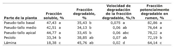 La fracción degradable fue estadísticamente mayor en la hoja que en el pseudo-tallo (p<0,05), mientras que el porcentaje degradable en el peciolo fue intermedio, lo que indica que el vástago se caracteriza por estar formado en mayor proporción por compuestos solubles (Cuadro 3), lo cual probablemente esté relacionado con la composición nutricional y el contenido de carbohidratos no fibrosos determinado en las muestras analizadas (Cuadro 1). Según Monçao et al. (2014), la fracción B (degradable) fue del 23,39% en cáscara de banano, lo cual fue menor a lo determinado (Cuadro 3); pero Keir et al. (1997), en muestras de la planta de banano, indicaron un 29,7% de material degradable, que es considerablemente más cercano a lo que se determinó en la presente investigación.