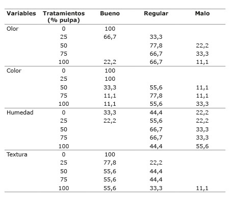 Se reconoce que la apariencia y el color del ensilaje de pulpa de café son característicos del proceso de ensilado, después de haber desarrollado una fermentación anaeróbica adecuada (Solomon, 1991). Al respecto, los tratamientos con 0% y 25% de inclusión de pulpa de café presentaron un color más parecido al original (antes de ensilar), contrario al resto de los tratamientos, los cuales presentaron un color más oscuro y diferente al original, lo cual se debió a que la pulpa de café tiende a cambiar su color original a uno más oscuro por efecto de la oxidación. Se ha reportado que existe un cambio en el color de la pulpa de café de color marrón a negro cuando los ensilajes se exponen al aire, lo cual se atribuye a reacciones enzimáticas causadas por la oxidación de los polifenoles o quinonas, las que, a su vez, se combinan con aminoácidos libres y proteínas para dar complejos de coloración oscura (Solomon, 1991). Por su lado, los tratamientos con 50, 75 y 100% de pulpa fueron mayormente calificados como regulares (Cuadro 1).