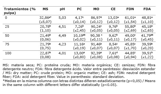 Los mayores valores de cenizas encontradas en el tratamiento sin pulpa (0%), podrían estar asociados al aporte de fibra por parte de los tallos de la gramínea, ya que los pastos poseen un mayor contenido de componentes de la pared celular que la pulpa de café (Yonatan et al., 2011). Los valores de cenizas y fibras fueron similares a los reportados en el trabajo de Yonatan et al. (2011).