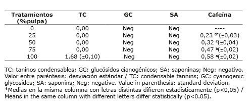 Table 3. Content of condensable tannins, cyanogenic glycosides, saponins and caffeine (%) of silage made with different percentages of pulp coffee ( Coffea arabica L.) in place of Pennisetum purpureum var OM-22 in Villaflores, Chiapas, México during 2015.