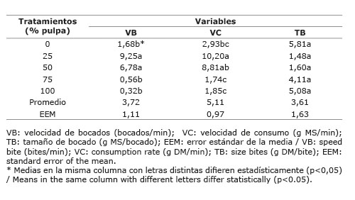 Sobre la conducta ingestiva se obtuvieron los valores más altos (p<0,05), para velocidad de bocados (VB) y velocidad de consumo (VC), para los ensilajes con 25 y 50% de inclusión de pulpa de café; sin embargo, el tamaño de bocado (TB) no difirió entre tratamientos (p>0,05) (Cuadro 4).