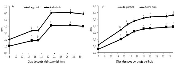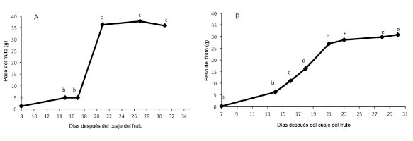 El peso del fruto de tacaco (Figura 1), presentó un incremento significativo (p<0,05) a partir del día 17 del cuaje del fruto, en los frutos con espinas (Figura 1A), mientras que en el tacaco sin espinas, este aumento se observó a partir del día 14 (Figura 1B); este comportamiento se mantuvo hasta el día 21 en ambos materiales, alcanzándose aproximadamente un 85% del llenado durante este período.