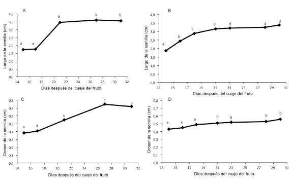 Las dimensiones del fruto y de la semilla, incrementaron significativamente a partir del día catorce en tacacos sin espinas o diecisiete en frutos con espinas y hasta el día veintiuno en ambos materiales (Figuras 2 y 3), tendencia similar a la observada en la variable ganancia de peso. El largo de la semilla alcanzó valores máximos de 3,4 cm y 3,6 cm en tacaco sin espinas (Figura 3 B y D) y con espinas (Figura 3 A y C), respectivamente. El aumento en el grosor de la semilla fue mayor en los frutos con espinas, ya que esta creció en promedio 0,34 cm entre el día 17 y la última evaluación, en comparación con los frutos sin espinas, donde el incremento fue de 0,11 cm.