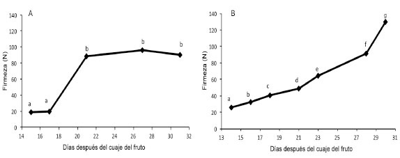 La firmeza del fruto incrementó a partir del día catorce en tacaco con espinas y desde el día diecisiete en frutos sin espinas, hasta alcanzar un máximo de 96,38 N y 129,87 N, respectivamente (Figura 4). En tacaco sin espinas, este aumento se observó durante todo el período de evaluación, mientras que en frutos con espinas fue a partir de los diecisite y hasta los veintiún días donde se presentó este cambio en la firmeza.