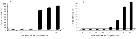 La presencia de fibras en el mesocarpo es indeseable desde el punto de vista de consumo de este producto (Morales, 1994). De acuerdo con los resultados obtenidos, la detección de fibra a los veintiún días en ambos materiales y el incremento en la firmeza a los veintiún días en tacaco con espinas y a los veinticuatro en tacaco sin espinas, podría ser un indicador de cosecha para el fruto sazón, lo cual también coincidió con observaciones adicionales realizadas por los autores (datos no mostrados), donde se determinó que a los veintiuno y veinticuatro días, aproximadamente, un 83% de los frutos presentan un endurecimiento de la cáscara. Con respecto a la fibra, Morales (1994) señaló que el peso seco de la fibra varía desde cero en algunos frutos, hasta cerca de un gramo en los materiales que la poseen, aunque no indica el período de inicio de formación de la misma.