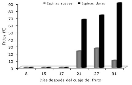 Las evaluaciones poscosecha se realizaron a partir de los siete y ocho días después del cuaje del fruto, en frutos sin espinas y con espinas respectivamente, con excepción del largo y grosor de la semilla, firmeza y color, las cuales se evaluaron a partir de los catorce o quince días después del cuaje, momento en que el fruto alcanzó un tamaño adecuado para realizar dichas mediciones. Del total de frutos marcados, sobrevivió aproximadamente un 40%, lo cual permitió muestrear treinta frutos con espinas y treinta frutos sin espinas en cada una de las evaluaciones, las cuales se realizaron hasta los 30 o 31 días, momento en el que ocurrió la abscisión de la mayoría de los frutos.