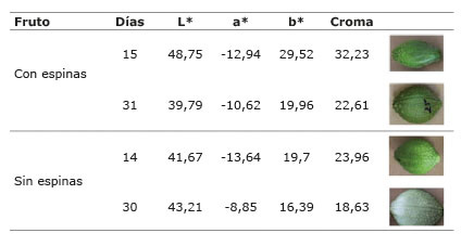 El color externo desde los quince hasta los treinta días, que correspondió a fruto inmaduro y sazón respectivamente, mostró un cambio, desde un color verde amarillento hasta un verde grisáceo (imágenes del Cuadro 1). Se dio un incremento en el valor de a*, y una disminución en el croma [√(a2+b2)] y en el valor de b*, lo cual se vio reflejado en el paso de un verde amarillento a un fruto con un color más oscuro y opaco, que se acentuó cerca de la abscisión del fruto y no en el momento de la aparición de la fibra y las espinas.
