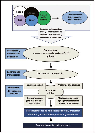 Figure 1. Temperature, water, saline-osmotic, and environmental pollutant stress induce transcriptome and general biochemical system remodeling, causing plant responses to reestablish cellular homeostasis and conferring tolerance and resistance to stress (translated from Sadras and Richards, 2014).