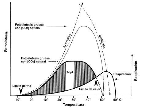 La principal consecuencia de la exposición de las plantas a las altas temperaturas es el descenso del balance de carbono, como resultado de la inactivación de la Rubisco2, la reducción de la fotosíntesis y del desbalance entre la fotosíntesis y la respiración. Este último ocurre a temperaturas cercanas a 50 °C, punto en el que la respiración oscura y la foto-respiración aumentan conforme la fotosíntesis cae considerablemente (Figura 2). Esta situación se ve atenuada en ambientes ricos en CO2 (Wahid et al., 2007).