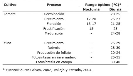 Los umbrales y las temperaturas óptimas pueden variar con los cultivares y el lugar donde estos fueron desarrollados. Por ejemplo, existen cultivares de maíz adaptados a zonas bajas, con un rango de temperatura de 20 a 38 °C, mientras que los de zonas altas poseen un rango de 7 a 27 °C (Laffite, 2001; Ruiz et al., 2002). Los efectos de la temperatura varían también con el desarrollo del cultivo y la fenología (Wahid et al., 2007). Por ejemplo, en tomate y yuca se pueden observar grandes diferencias en los rangos de temperatura adecuados para sus diferentes fases del desarrollo (Cuadro 2).