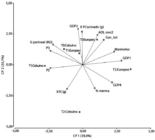 xFC: shear forcé (kg); P2: 60 days live weight; P3: 90 days live weight; G perirenal: perirenal fat; GDP2: daily weight gain to 60 days; XPCoc(g): cooked weight; AOL: loin eye area; Gan Tot: total income for the period; GDP1: daily gain to 30 days; GDP4: daily gain to 120 days; %merma: carcass depletion at 24 h post mortem.