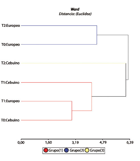 Figure 2. Grouping of clusters as treatment and racial component based on the set variables analyzed in “La Vega” beef cattle farm of the Agronomy School of Technological Institute of Costa Rica from the San Carlos Regional Headquarters located in Alajuela of Costa Rica. 2014.