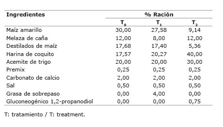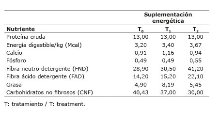 El nivel de suplementación energético antes de la cosecha tiene un efecto positivo en el crecimiento del animal y los rendimientos posteriores (Gallo et al., 2013). Los resultados observados en el estudio difieren a lo descrito, probablemente debido a una sobrevaloración de la fuente energética (1,2-propanodiol) utilizada en el tratamiento más energético, ya que se utilizaron las características nutricionales reportadas para la estimación de la cantidad de energía que podría generar el producto según la dosis recomendada. Un mayor contenido de carbohidratos no fibrosos genera una mayor eficiencia en la fermentación ruminal, con mayor producción de ácidos grasos volátiles lo que favorece la deposición de tejidos (Rueda et al., 2006). El tratamiento T2 fue el que contenía menor cantidad de granos de cereales, lo que puede explicar los menores valores de ganancias diarias de peso y peso vivo final obtenidos.