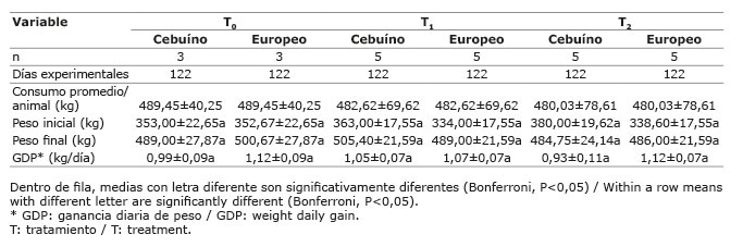 En animales europeos se han referido ganancias superiores, de 1,54 y 1,56 kg/d en raciones con cebada+ryegrass y cebada, respectivamente (Zaman et al., 2002). Esto implica que la naturaleza de la fuente alimenticia determina el desempeño fenotípico favorable de animales Bos taurus respecto a los Bos indicus durante el crecimiento (Özlütürk et al., 2004; Riera et al., 2004; Waritthitham et al., 2010).