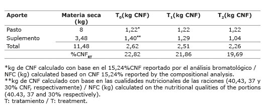 Table 4. Non fiber carbohydrates (NFC, %) contribution in the total ration (TR) according to treatments used for supplementation of steers being finalized in “La Vega” beef cattle farm of the Agronomy School of Technological Institute of Costa Rica from the San Carlos Regional Headquarters located in San Carlos of Costa Rica. 2014.