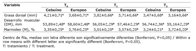 Al analizar el efecto del componente racial sobre la grasa dorsal, desarrollo muscular y marmoleo no hubo diferencias estadísticas (p>0,05) (Cuadro 5). El desarrollo muscular se correlaciona negativamente con la grasa dorsal (Moreira et al., 2003), lo que pudo explicar la tendencia mostrada por T0, T1 y T2, en donde los animales B. indicus mostraron mayor espesor de grasa dorsal que los F1 B. taurus * B. indicus . Estos resultados coinciden con los reportados por Chauychuwong et al. (1997), al comparar B. taurus , B. indicus y sus cruces en donde los animales con mayor proporción de genes europeos mostraron mejor desarrollo muscular y menor espesor de grasa dorsal.