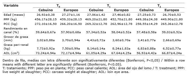 En la planta procesadora de carne se evaluaron variables como peso en pie en planta (PPP), peso de la canal caliente (PCC) al final de la línea de cosecha, porcentaje de rendimiento en canal, peso de la grasa perirrenal (PGP) y el desarrollo muscular (DM). Después de veinticuatro horas post mortem, a las canales refrigeradas (4 °C) se les evaluó el grosor de grasa de cobertura (GG) sobre el Longissimus dorsi lumborum (LDL), mediante el promedio de tres medidas tomadas perpendicularmente a un cuarto, la mitad y tres cuartos del eje longitudinal de la superficie del músculo. Sobre el mismo músculo fue determinada la grasa intramuscular (marmoleo), mediante patrones fotográficos (AMSA, 1995) cuya escala fue modificada a una escala de cinco puntos donde 0 = desprovisto de marmoleo; 1 = trazas de marmoleo; 2 = marmoleo ligero; 3 = marmoleo moderado; 4 = marmoleo abundante. El área de sección transversal del L. dorsi lumborum (AOL) fue determinado a las 24 h post morten, realizando un corte a nivel de la intersección entre la 12-13a costilla, se humedeció levemente el área transversal con agua destilada y posteriormente se marcó la circunferencia del lomo con lápiz de grafito y se cuantificó el área circunscrita con una tabla cuadriculada (USDA, 1990) validada para la estimación.