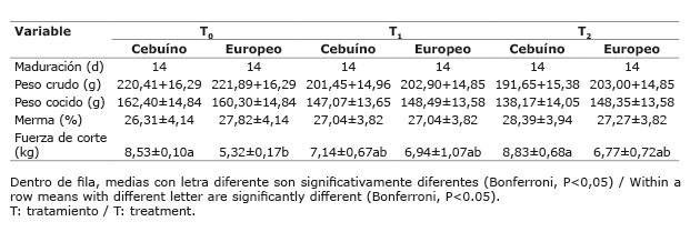 Al analizar el efecto de la raza sobre la fuerza de corte a los catorce días de maduración, se encontraron diferencias estadísticas (p<0,05) (Cuadro 7). Los animales europeos presentaron en promedio menores valores de fuerza de corte (6,34 contra 8,17 kg). Similares resultados se han reportado al comparar la fuerza de corte en animales y B. taurus * B. indicus en condiciones de pastoreo y suplementación con dietas a base de maíz en Argentina (Latimori et al., 2008), Tailandia (Waritthitham et al., 2010) y Paraguay (Paniagua y Ocampos, 2013).