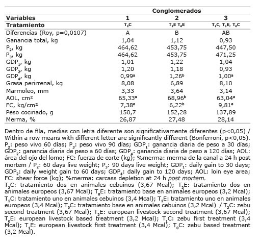 La variable AOL presentó los valores mayores (p<0,05) para el conglomerado dos. Esto coincide con los reportado por Bidner et al. (2002) y Casas et al. (2009), quienes informaron que los animales Bos taurus alimentados con dietas energéticas y en pastoreo, tienden a ser superiores en cuanto a calidad de la canal con respecto a los animales Bos indicus ; sin embargo, la selección genética para el área del ojo del lomo en estos últimos, puede aumentar significativamente los valores y mejorar otras características como la ganancia de peso y la grasa corporal, debido a las correlaciones genéticas (Zuin et al., 2012; Caetano et al., 2013).