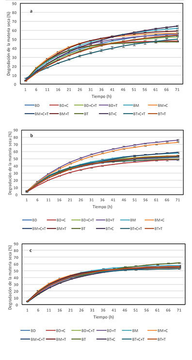 La fracción a en la combinación BT+C+T bajo la condición sin sombra, fue menor, y presentó diferencia significativa (p<0,05) y una tendencia estadística (p=0,0785), con la fracción a de la misma combinación bajo la condición de 60% y 30% de retención de luz, respectivamente. Estos resultados indicaron que al incrementar la cantidad de sombra, hubo una disminución lineal de la materia seca rápidamente degradable en rumen, asociada a la combinación BT+C+T. Sin embargo, pese a no registrarse diferencias significativas en los parámetros b y c, la simulación de la degradación potenciada hasta las 72 h (Figura 1), indicó que bajo la condición de retención del 30% de la luz, las combinaciones BM+C y BD+T obtienen la mayor tasa de degradación con valores que alcanzan el 78,6 y 76,9% de la MS. Asimismo, se observó, que al disminuir el 30% de luz, las gramíneas en monocultivo presentaron menor degradación potencial, que al estar asociadas a arbustivas.