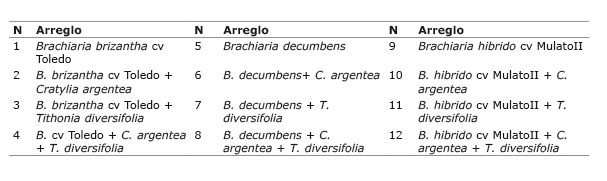 Table 2. Grasses arrangements alone or associates to strumbs in silvopastoral arrangements that were employed in order to determine their potential use in Bajo Cauca Antioquia. Candelaria farm, University of Antioquia, Caucasia, Antioquia, Colombia. 2012.