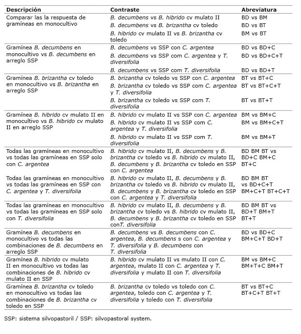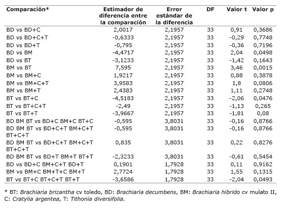 Table 3. Planned comparisons between the different arrangements used (grassed alone or associated to shrubs in silvopastoral arrangement), in order to determine their potential use in Bajo Cauca, Antioquia. The Candelaria farm, University of Antioquia, Caucasia, Antioquia, Colombia. 2013.