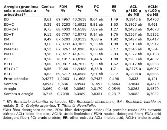 Los resultados de composición química del forraje de cada arreglo evaluado se presentan en el Cuadro 4. Para ninguna de las variables se presentó efecto significativo del nivel de sombra ni de la interacción sombra x arreglo (p>0,05).