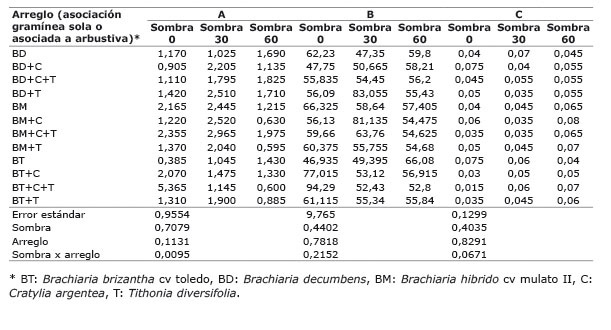 La interacción entre el arreglo utilizado y el nivel de sombra indicó que algunos asocios responden de manera diferente a la disminución en la incidencia vertical de luz. En las gramíneas del género Brachiaria, las cuales han sido descritas como medianamente tolerantes a ambientes bajo sombra (Wong, 1991), han sido reportados cambios en el porcentaje de materia seca (Gobbi, 2007), modificaciones en la altura de la planta y cambios en su área foliar específica (Martuscello et al., 2009), como respuesta a alteraciones en la incidencia de luz. Estas alteraciones morfológicas, son correspondientes con cambios bromatológicos que pueden alterar la dinámica de degradación ruminal de compuestos fibrosos.