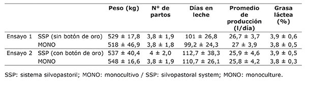 Ensayo 1: se llevó a cabo entre el mes de marzo y abril de 2015 y tuvo una duración de 36 días. Los tratamientos utilizados fueron un SSP con botón de oro (Tithonia diversifolia) y pasto kikuyo (Cenchrus clandestinum) y un sistema monocultivo de kikuyo. Los animales que se encontraban en el SSP solo tuvieron acceso al consumo de la gramínea, la arbustiva se protegió con cinta eléctrica. En ambos tratamientos se suministró alimento concentrado acorde a la producción de leche de cada animal, con una relación leche:concentrado de 3,71:1