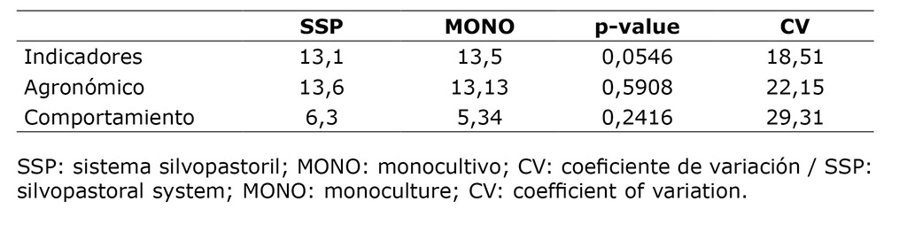 Los datos obtenidos por los métodos de indicadores y de comportamiento al pastoreo se analizaron mediante un diseño rectángulo latino con dos tratamientos (SSP y MONO), dos períodos de medición y doce unidades experimentales.