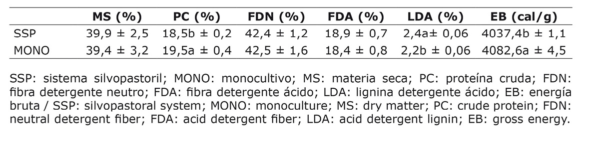 En los Cuadros 3 y 4 se presenta la composición química de la dieta y el consumo de nutrientes estimado por el método de indicadores para los dos tratamientos en el ensayo 1. Se encontró diferencia significativa en la composición química de la dieta entre tratamientos. La PC, LDA y energía fueron mayores en la dieta de los animales que pastoreaban en el monocultivo, mientras que FDN y FDA fueron mayores en la dieta de los animales del SSP, y no hubo diferencia significativa en el contenido de MS de las dietas (Cuadro 3). La ingesta de nutrientes mostró diferencias significativas entre tratamientos, con un mayor consumo de MS, FDN, FDA y energía en el SSP, sin diferencias para la PC y LDA (Cuadro 4).