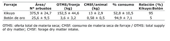 Con el método agronómico se pudo establecer cuál fue la disponibilidad por área de pasto kikuyo y botón de oro (Cuadro 8) para el ensayo 2, a su vez se pudo determinar cuál fue la cantidad consumida de cada uno de estos forrajes, con un consumo promedio de materia seca de 13 ± 2,9 kg para el kikuyo y 0,58 ± 0,5 kg para el botón de oro, representando para este sistema de baja densidad una relación de consumo kikuyo:botón de oro de 95:5. Sin embargo, se evidenciaron consumos hasta de 2,2 kg de materia seca de botón de oro por animal, cuando la oferta de materia seca total por franja de esta arbustiva fue de 13,3 kg, lo que representa una relación de 73:27.