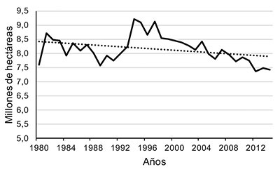 La superficie sembrada con maíz tuvo una tasa de crecimiento media anual de -0,06%, de 1980 a 2014; en 1980 se cultivaron 7 597 251 hectáreas (ha), cifra que en 2014 fue de 7 426 412 ha mostrando tendencia negativa; la disminución en el periodo de estudio fue de 170 839 ha. La relación matemática obtenida fue y=8,4333-0,0153x, esta significa que por cada cambio unitario en la variable independiente (tiempo expresado en años), la superficie sembrada disminuye en 0,0153 millones de hectáreas, lo que es equivalente a 15 300 ha por año. Dicha situación, se debe en buena medida al deterioro paulatino de los precios reales pagados a los productores por el grano, lo que los ha llevado a buscar alternativas de cultivos más rentables. Se observan variaciones en la superficie sembrada con maíz, en 1994 fue donde mayor superficie se sembró, con 9 196 478 ha (Figura 1). Por el contrario, de 1994 a 2014 hubo una disminución de 1,8 millones de hectáreas.