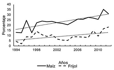 En ambos cultivos se registraron picos de producción en 1994, que fueron incentivados por las políticas agropecuarias implementadas para mitigar los posibles efectos negativos del Tratado de Libre Comercio de América del Norte (TLCAN), dirigidas a los productores de oleaginosas y granos básicos, a través del Programa de Subsidios Directos a la Agricultura (PROCAMPO). El frijol es definido en la Ley de Desarrollo Rural Sustentable de México (DOF, 2001) como un producto básico y estratégico para el desarrollo rural del país, ocupa el segundo lugar en superficie sembrada a nivel nacional, con un promedio de 1,85 millones de hectáreas. En los últimos años la superficie de maíz cosechada en temporal (6 millones de ha) y riego (1,1 millones de ha), han permanecido relativamente constantes. Resalta la drástica reducción en la superficie cosechada bajo temporal y el aumento de la superficie de riego en 2005, que hizo que la producción en ambos regímenes casi se igualara. La mayor parte del maíz bajo riego (56,1%) se siembra en las entidades con zonas áridas (Márquez et al., 2006). Lo anterior, se puede explicar desde la perspectiva de los apoyos gubernamentales sobre el fomento a la comercialización con variedades que demanda el mercado nacional, así como paquetes tecnológicos adecuados, y sobre todo, productores comerciales de gran experiencia.