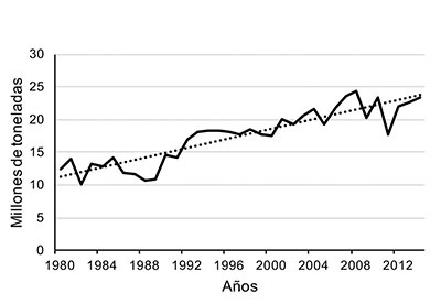 La producción de maíz en el periodo de 1980 a 2014 tuvo una tasa de crecimiento media anual de 1,82%, con un incremento de 10,1 millones de toneladas, finalizando el 2014 con una producción de 23,3 millones de t y una tendencia de y=10,894+0,3656x. En la Figura 3, se muestra la producción de maíz, existiendo altibajos de 1985 a 1989, cuya disminución fue de 26,8% equivalente a 3,2 millones de t; de 2008 a 2009 la disminución fue de 17,5% con 4,3 millones de t, y de 2010 a 2011 la caída fue del 24,3% y de 5,7 millones de toneladas. Este incremento se dio principalmente en utilización de semillas mejoradas y la utilización de fertilizantes.