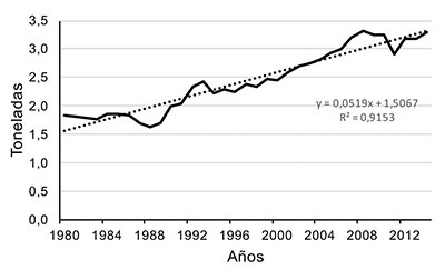 Figure 5. Tons/hectare corn yield in Mexico, from 1980 to 2014.