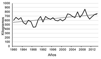 Los rendimientos del frijol por hectárea pasaron de 600 a 760 kg, con una tasa de crecimiento media anual de 0,68% durante 35 años que comprende el periodo de estudio, con altibajos en dicho rubro; en 1988 se registró el menor rendimiento con 440 kg/ha y el más alto en 2009 con 860 kg/ha (Figura 6). El incremento que tuvo en el periodo de estudio fue de 160 kg/ha.