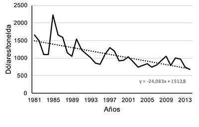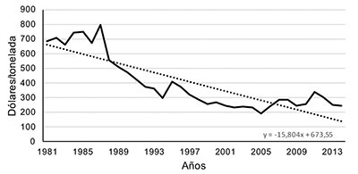 El precio del maíz a precios constantes deflactados con el INPP de junio de 2012, y transformados de pesos mexicanos a dólares estadunidenses, tuvo una disminución de 441,9 dólares/tonelada durante el periodo de estudio; en 1981 se pagó 684,5 USD/t y en 2014 finalizó en 242,6 USD/t, la disminución fue del 64,4% en 34 años. Durante 1982, 1984-1985, 1987, 1995, 2000, 2003, 2006-2008 y 2010-2011, el precio del maíz se incrementó en 3,4, 13,4, 18,5, 37,2, 5,8, 2,4, 45,3 y 36,1% con respecto a su año inmediato anterior, equivalente a 23,6, 89,4, 124,2, 111,1, 14,8, 5,5, 96,7 y 91,1 dólares por tonelada, respectivamente. Por otro lado, los años de 1983, 1986, 1988-1994, 1996-1999, 2001-2002, 2004-2005, 2009 y 2012-2014 los precios disminuyeron en 6,8, 10,3, 88,8, 44,6, 14,5, 19,9, 14,4 y 30,6%, con respecto a su año inmediato anterior, equivalentes a -48,1, -77,1, -217,8, -154,6, -38,1, -46,1, -41,4 y -94,7 dólares por tonelada, respectivamente (Figura 7).