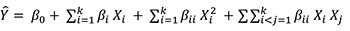donde ŷ es el valor predicho de la variable de repuesta; β0, βi, βii, y βij son los coeficientes de regresión para la intercepción, lineal, cuadrática y efectos de interacción, respectivamente; k es el número de parámetros independientes (k = 3 en este estudio), y Xi, Xj son los niveles codificados de las condiciones experimentales.