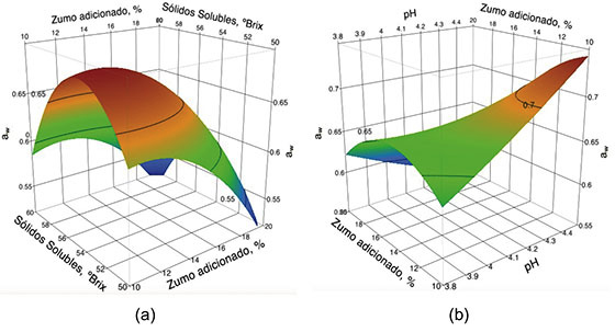 En el ANOVA hubo diferencia significativa (p<0,05) para el factor zumo adicionado (p=0,0015), el factor cuadrático sólidos solubles (p=0,0009) y la interacción pH-zumo adicionado (p=0,0285). En la ecuación 4 se presenta la actividad de agua (aw) en función de los factores significativos codificados (pH, SS: sólidos solubles, ZA: zumo adicionado).