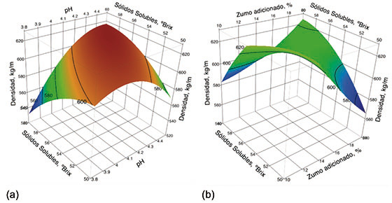 Figure 5. Response surface of apparent density as a function of (a) pH and soluble solids, (b) juice added and soluble solids in bitter orange (Citrus aurantium L.) juice co-crystallized. Monteria, Colombia, 2015.