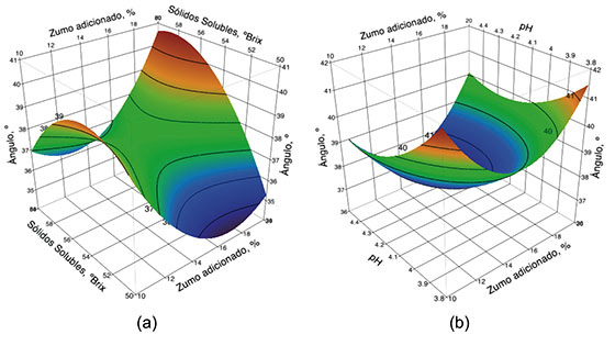 En la Figura 6b se muestra el efecto cuadrático del zumo adicionado, en el cual se presentó un mínimo del ángulo de reposo cuando la cantidad del zumo adicionado estuvo en aproximadamente un 15%.