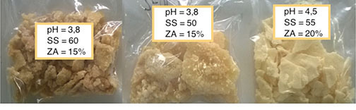 Se pudo apreciar visualmente que todas las muestras obtenidas presentaron diferencias en el color, textura y morfología. En la Figura 1 se presentan varios tratamientos de zumo de naranja agria cocristalizado antes de ser molturados, a diferentes condiciones de pH, sólidos solubles (SS) y zumo adicionado (ZA).