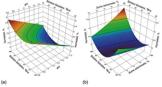 Figure 2. Response surface of moisture as a function of (a) pH and soluble solids, (b) juice added and soluble solids in bitter orange (Citrus aurantium L.) juice co-crystallized. Monteria, Colombia, 2015.